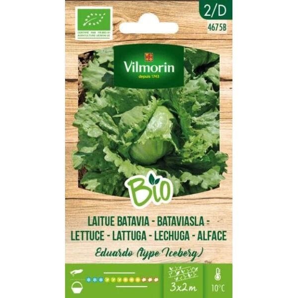 Bataviasla Eduardo BIO van Vilmorin is een variëteit met mooie ronde kroppen en knapperige bladeren. Zaaien kan van april tot augustus.