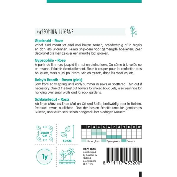 Deze soort is bijzonder door zijn lichtroze schijn op de bloemen. Deze eenjarige planten vormen hele wolken, grote, witroze bloemen. Ook prachtig in boeketten als opvulling te gebruiken en geschikt als droogbloem.
