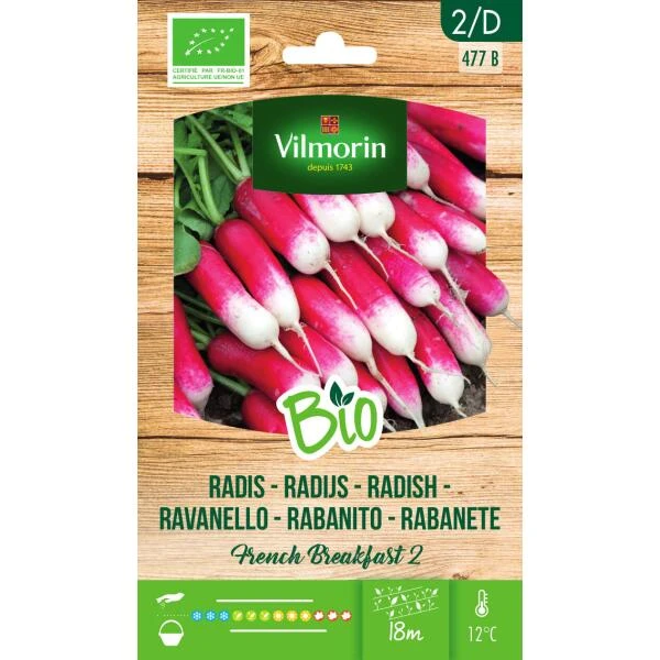 Wil je graag zelf radijsjes kweken en liefst biologisch? Met de BIO zaden van Vilmorin is dat mogelijk. Radijs French Breakfast 2 is een snelgroeiend ras met een milde, niet pikante smaak. De radijsjes zijn langwerpig van vorm.