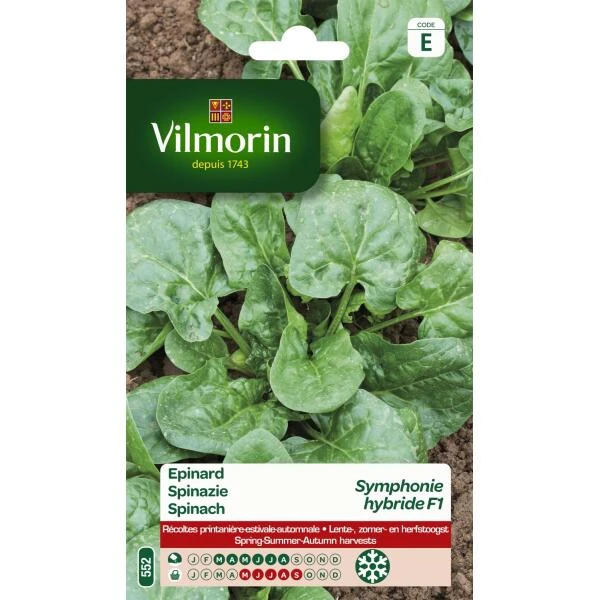 Zeer productieve variëteit Spinazie Symphonie met grote, gladde, donkergroene bladeren. Geschikt voor voorjaars-, zomer- en herfstteelt en weinig gevoelig voor doorschieten.