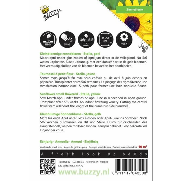 Stella is een éénjarige zonnebloem, met een prachtige, gele bloemkleur. De planten vertakken en geven 2 tot 6 bloemen per steel. De stelen worden zo’n 140 cm hoog.